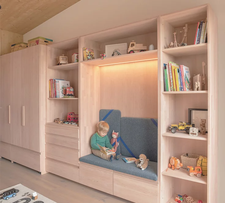 - Die Wickelkommode: Eine Wickelkommode aus Massivholz ist nicht nur funktional, sondern auch ästhetisch ansprechend. Achten Sie darauf, dass sie über ausreichend Stauraum für Windeln, Kleidung und weitere wichtige Babyutensilien verfügt. Das Wandmodul von TEAM 7 vereint Wickelkommode und Home-Office. Sobald Ihr Kind groß genug ist, kann das Modul zum Schreibtisch für das Kinderzimmer oder zum Wohnoffice umfunktioniert werden.