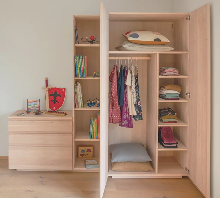 - Ein Schrank: Ein Kinderzimmer Massivholzschrank bietet ausreichend Platz für die Aufbewahrung von Babykleidung, Spielzeug und anderen Dingen. Entscheiden Sie sich für einen Schrank mit stabilen Regalen und Schubladen, die leicht zu öffnen und zu schließen sind.