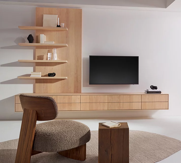 Ein modern eingerichtetes Wohnzimmer aus Massivholzmöbeln bietet eine angenehme Atmosphäre und lässt den Raum größer und einladender erscheinen. Der größte Eyecatcher ist eine modulare Wohnwand aus Holz. Modern und praktisch verbindet sie einzelne Schrank- und Schubladenelemente und sorgt für ein stimmiges Finish. Ganz besonders persönlich wird Ihr Wohnzimmer durch die individuelle Anordnung der Designelemente der Wohnwand. Die Serien cubus, cubus pure und filigno von TEAM 7 können ganz nach eigenen Vorstellungen von Ihnen gestaltet und angeordnet werden. Werden Sie selbst zum Architekten.