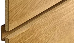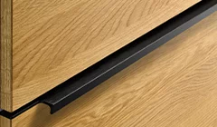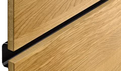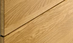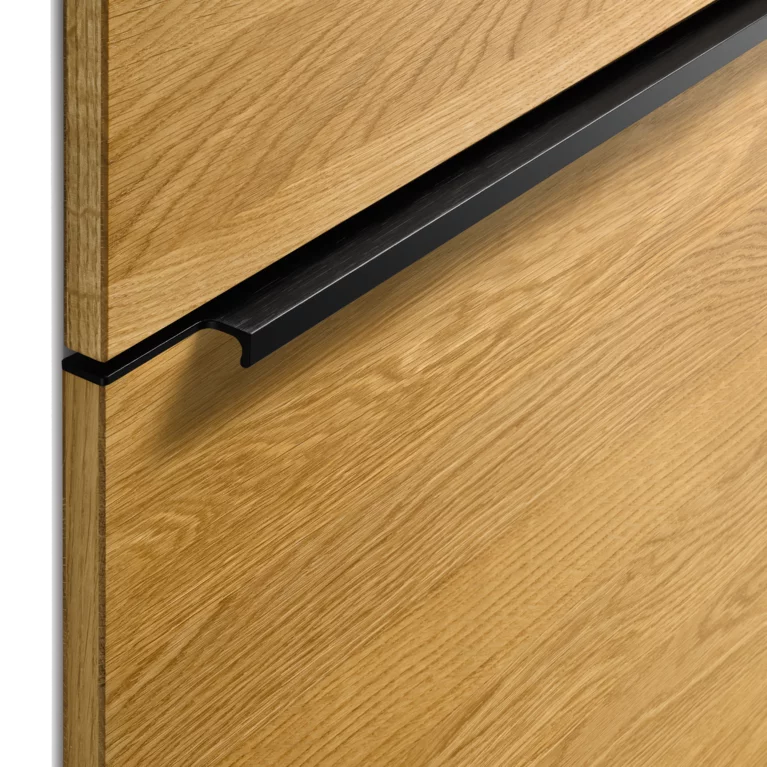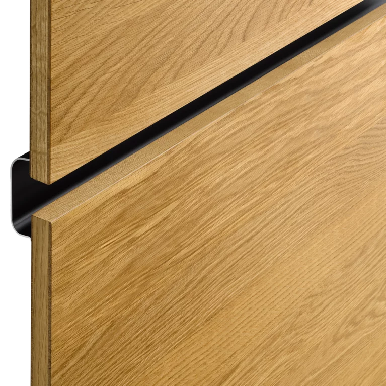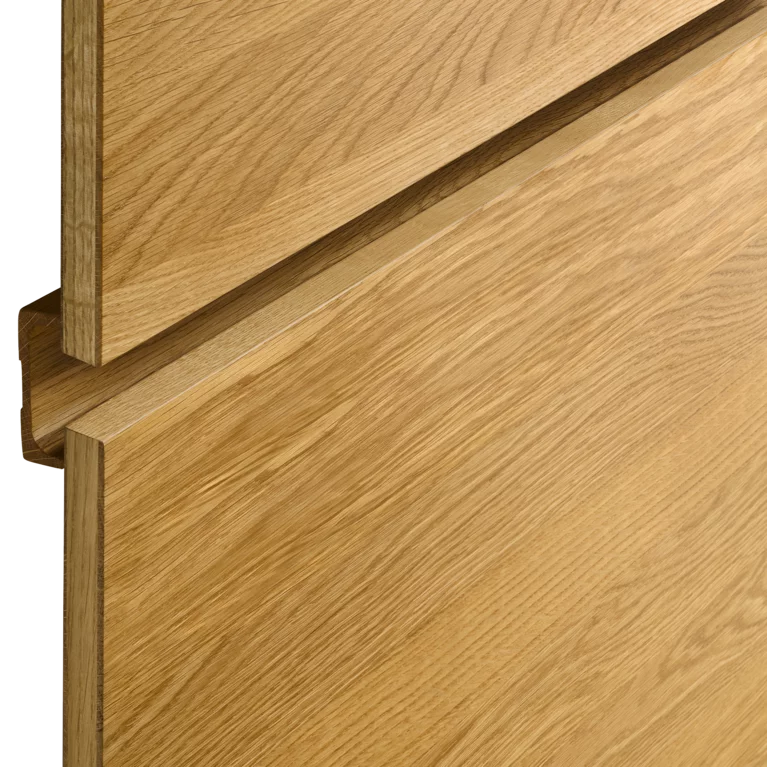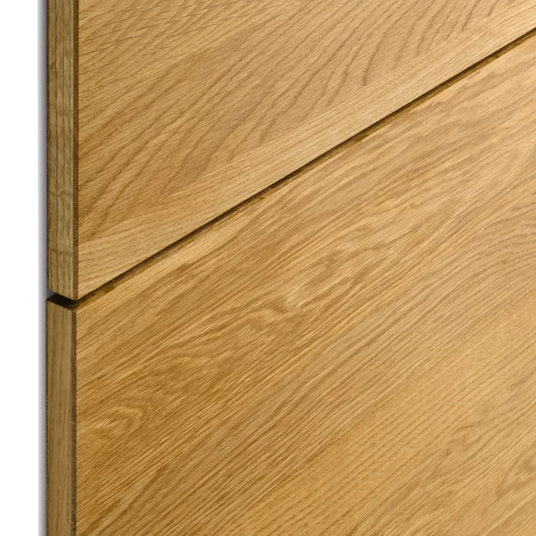 Die senkrechten Fräsungen in den Fronten und Seitenwangen zeugen von präziser Handwerkskunst und heben den Massivholzcharakter hervor. Sie setzen haptische Akzente und erzeugen optische Tiefeneffekte. Variierend in den Abständen verschmelzen sie mit den Frontfugen zu einem harmonischen Ganzen, wodurch die einzelnen Schränke in ihrer Anmutung wie ein einziges Möbel wirken. Durch die Asymmetrie der Rillenstruktur und der stets senkrechten Maserung entsteht eine lebendige Optik über mehrere Fronten hinweg, die auch bei individuellen Breitenkürzungen ihre durchgängige Ästhetik behält.
