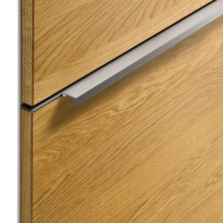 echt.zeit evo ist der nächste Schritt in der Evolution eines außergewöhnlichen Frontprogramms, dessen Design handwerkliche Präzision und echtes Holz zelebriert. Vertikale Fräsungen, bewusst asymmetrisch gesetzt und stets in voller Höhe der Front durchlaufend, erschaffen eine faszinierende Ästhetik, die die Küche optisch als ein Möbel erscheinen lässt.