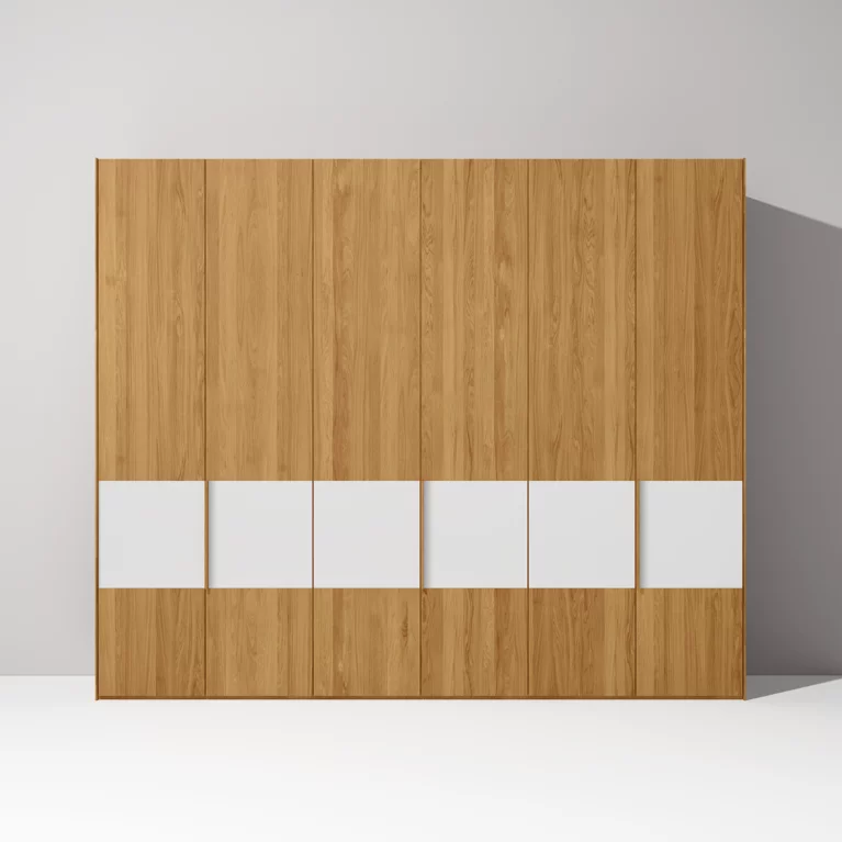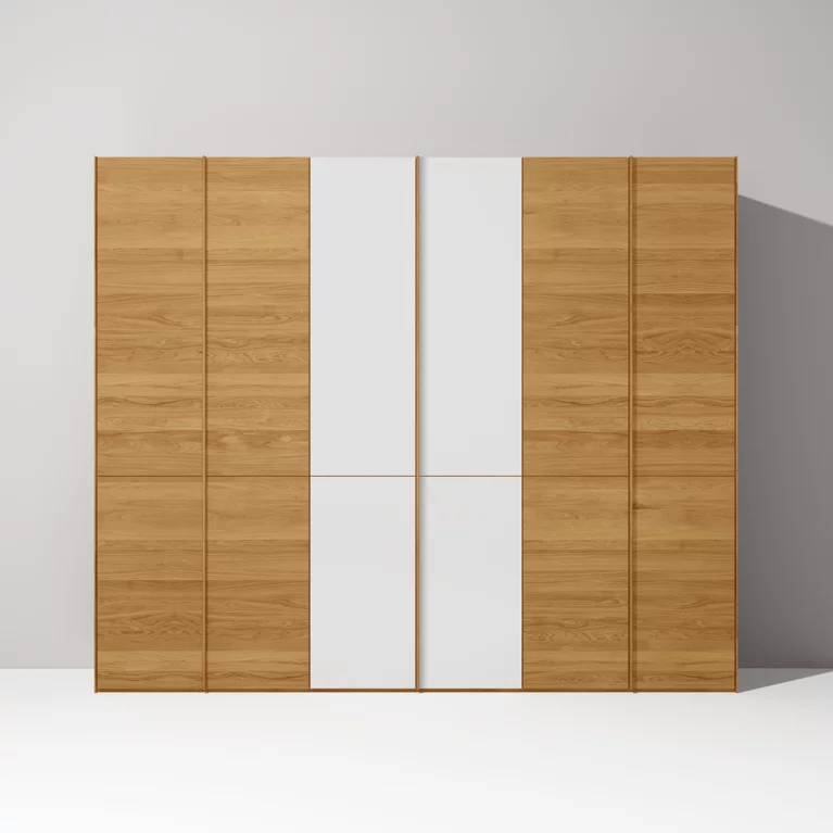 Crafted with care, our hinged-door wardrobes are exceptionally strong and durable. The main element is made of solid wood, while the three-layer solid wood panels that form the fronts hold their sleek-lined shape with exquisite precision.